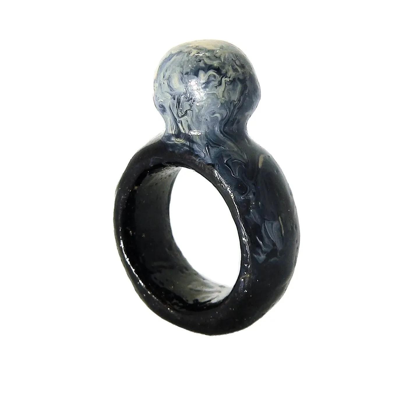 Superbe bague d'ornement de la gamme Totem, très confortable à porter par la forme biseauté de l'anneau tout en étant solide, d'une épaisseur moyenne de 4 mm, affinée uniquement au papier de verre, pas de vibrations d'un moteur à main. Emaillée, puis peinte en noir abyssal avec effet fondu gris au niveau de la forme ronde surplombant l'anneau. Peinture et vernis cuits. La hauteur totale de la bague est de 4, 4 cm pour une largeur de 2,8 cm ; la largeur de l'anneau est de 1 cm pour une épaisseur moyenne de 4 mm. D'un poids de 11 grammes, cette bague d'allure massive est légère. Pour hommes ou femmes, cette bague convient pour une circonférence de doigt comprise entre 67 à 69 millimètres max, au-delà de 69 mm, elle risque de serrer, voire de garoter le doigt. C'est une pièce unique.