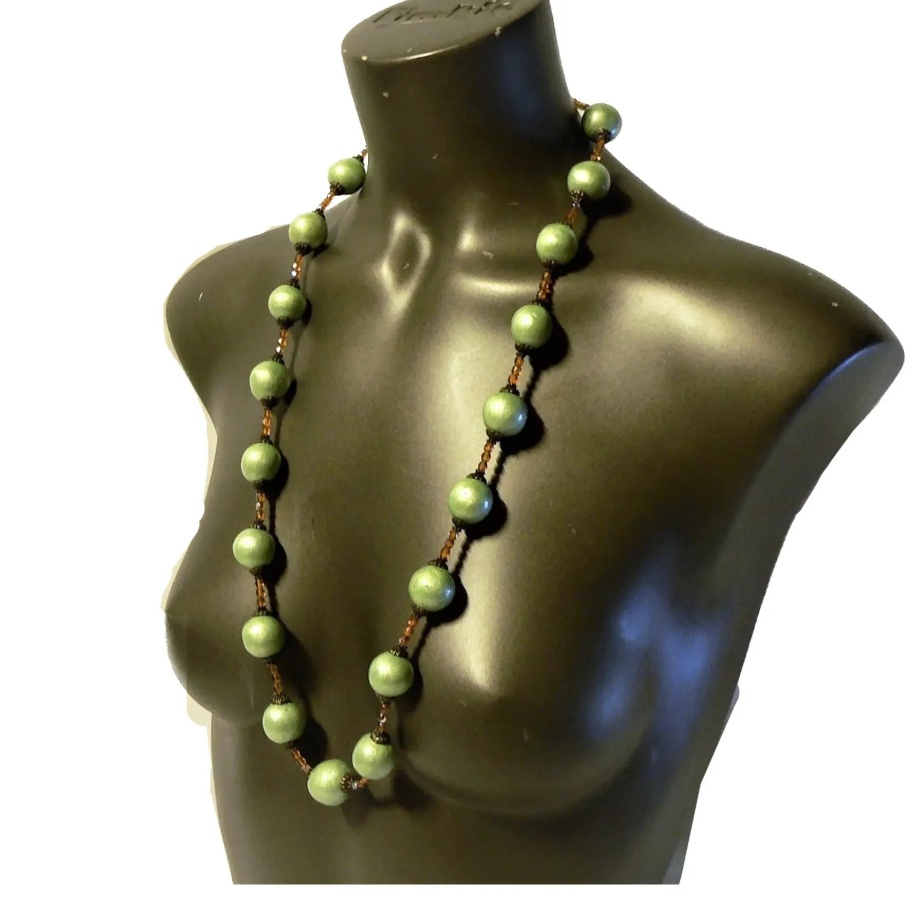 Collier vert amande : L'association de perles en verre tchèque facettées de couleur ambre et de coupelles en métal bronze, lui donne un style un peu rétro, voire moyenâgeux, et relève magnifiquement la couleur vert amande. C'est un sautoir plein de charme pour mettre en valeur, soirée, théâtre par exemple. Poids : 150 g. Longueur de fermoir à fermoir : 82 cm, fermoir à vis. Montage : câble acier inoxydable. Composition : 19 perles céramiques + éléments ornementaux de qualité. Féminin, lumineux et harmonieux ce sautoir est de belle qualité. C'est une pièce unique.
