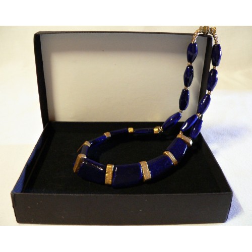 Superbes couleurs bleu lapis et or associées qui donnent à ce ras-de-cou énormément de charme et d'élégance. Ce collier est composé de 27 pièces céramiques de trois formes différentes et de petits éléments ornementaux, fermoir à vis ; il est ajusté sur câble acier inoxydable, en double rang pour ce modèle. Confortable avec un poids de 59 grammes pour une longueur de 43 cm minimum, prévoir toutefois de la marge pour un bel effet (diamètre : 14 cm). Lumineux, il pare magnifiquement le décolleté.