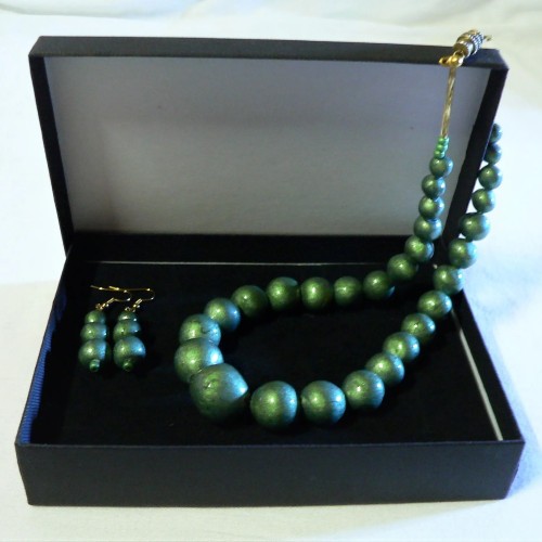 Cet ensemble composé d'un collier et d'une paire de boucles d'oreilles et classique et raffiné. Le collier est composé de 29 perles céramiques dégressive et est léger avec un poids de 75 grammes pour une longueur de 44 cm. Ajusté sur câble acier inoxydable, fermoir à vis. Très beau travail de peinture et vernis cuits. Les boucles d'oreilles sont d'une longueur de 6 cm, crochet inclus, crochet en métal doré, devient couleur bronze avec le temps mais reste joli. Sobre et lumineux, cet ensemble peut-être porté au quotidien, Très joli et tout en finesse. Pièce unique.