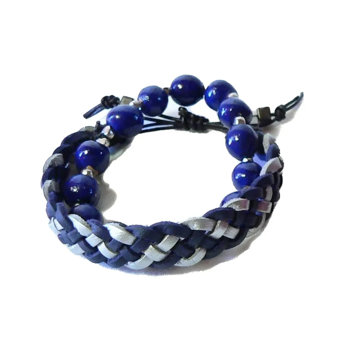 Joli petit ensemble comprenant un bracelet tressé en suédine bleue et argent et un bracelet en perles céramiques bleue. Le bracelet tressé est réglable : diamètre ouvert pour entrer la main : 9-10 cm, diamètre fermé : 5 cm (voir photos). Tressage suédine bleue et argent 5 brins, la partie réglable du bracelet est faite avec du lacet de cuir marron de 1 mm de diamètre (doublé), petites perles cubes en métal argenté en finition, nœud coulissant, et point de colle à toutes les fins de nœuds et extrémités du bracelet, finitions soignées. Le petit bracelet en perles céramiques tout simple est ajusté sur un fil nylon noir magic stretch (très résistant), perles en forme de petits cœurs en intermédiaire. Une seule couche de peinture bleue lapis sur terre cuite. Diamètre du bracelet sans étirement : 5 cm, esthétiquement convient pour un diamètre de 6,5 à 7, 5 cm environ, (la majorité). Très mignon et léger, il constitue un bel ensemble confortable avec le bracelet tressé. Pièce unique. Livrés avec boite. Frais de livraison inclus.