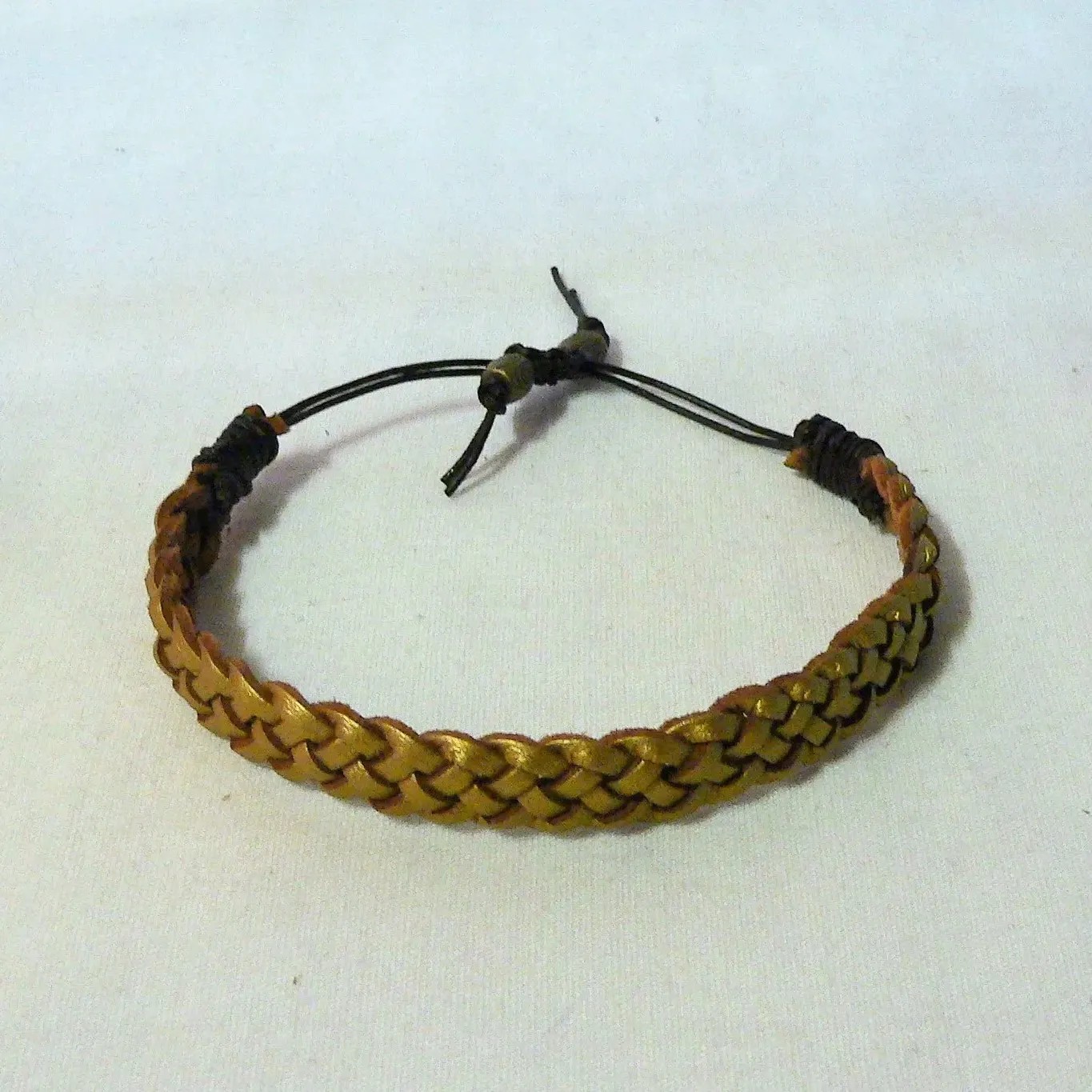 Joli bracelet tressé en suédine couleur or et cuir réglable : diamètre ouvert pour entrer la main : 10-11 cm, diamètre fermé : 6 cm (voir photos). Tressage suédine couleur or, 5 brins, la partie réglable du bracelet est faite avec du lacet de cuir marron de 1 mm de diamètre (doublé), perles métal bronze en finition, nœud coulissant, et point de colle à toutes les fins de nœuds et extrémités du bracelet, finitions soignées. Sobre, confortable et simplement beau il conviendra à la grande majorité avec une grande amplitude de circonférence de poignet, de 15 à 20 cm. La largeur du tressage est de 12 mm. Livré dans sa boite.