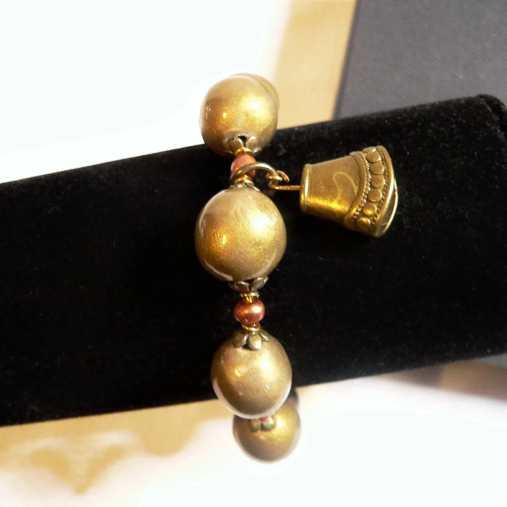 Atypique et original ce bracelet relativement volumineux est composé de 8 perles céramiques d'un diamètre moyen de 1,5 cm et peut se porter quotidiennement avec un poids de 29 grammes pour une longueur de 19 cm, convient à une circonférence de poignet jusqu'à 18 cm maximum. La peinture est très lumineuse, très bel effet avec sa breloque métal bronze en forme de cloche. De nombreux éléments ornementaux, coupelles en métal bronze, et perles couleur cuivre. Ajusté sur câble acier inoxydable, fermoir mousqueton. Pièce unique.