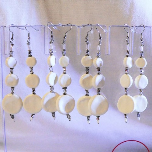 Mobiles, seyantes et lumineuses, ces boucles d'oreilles sont composées de 3 pièces céramiques plates dégressives de couleur blanc laqué et ajustées sur crochets inoxydables et câble acier inoxydable. Le poids varie entre 8 et 9 grammes par oreille et longueur maximale crochet inclus de11 cm. Elles mettent en valeur le port de tête ; massives avec un poids qui est toutefois raisonnable. Elles sont ravissantes. Livrées en boîte, emballage soigné.